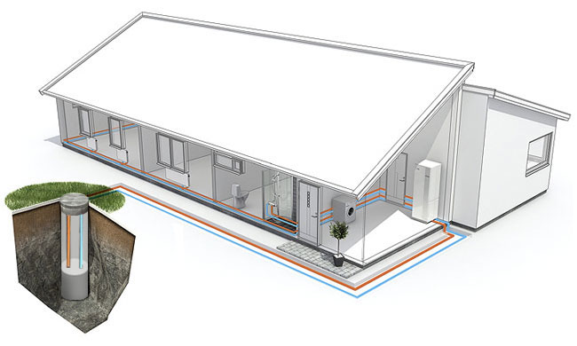 Má celoročne stabilnú teplotu cca 9 °C, čo zabezpečuje vysokú účinnosť aj počas nízkej exteriérovej teploty. Hlbinné vrty majú minimálne požiadavky na plochu pozemku. Prenos tepla medzi podložím a tepelným čerpadlom typu zem-voda zabezpečuje teplonosná kvapalina, ktorá prúdi v potrubiach uložených vo vrtoch. Nemrznúca zmes spĺňa všetky ekologické požiadavky na ochranu životného prostredia.