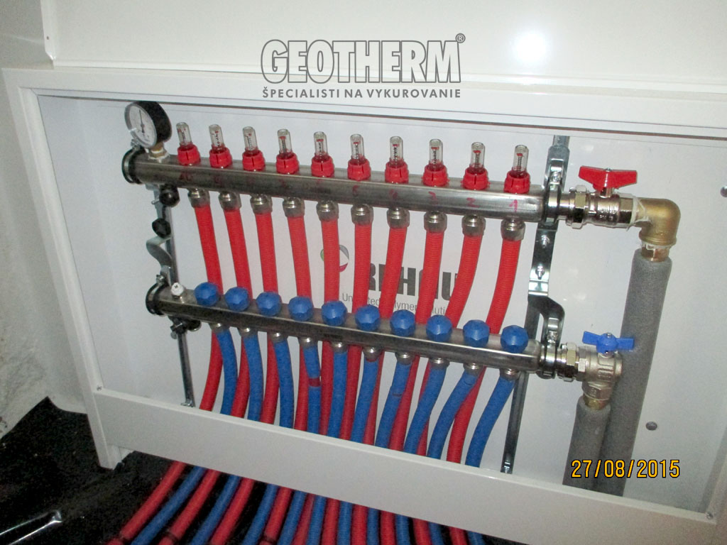 Podlahové vykurovanie REHAU, Borová, rodinný dom, plocha 130 m2, rozdeľovač HKV-D SX 12, 12 samostatne nastaviteľných okruhov.