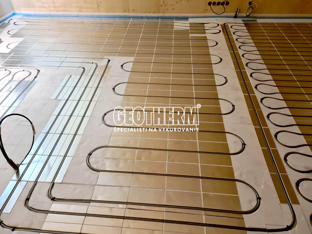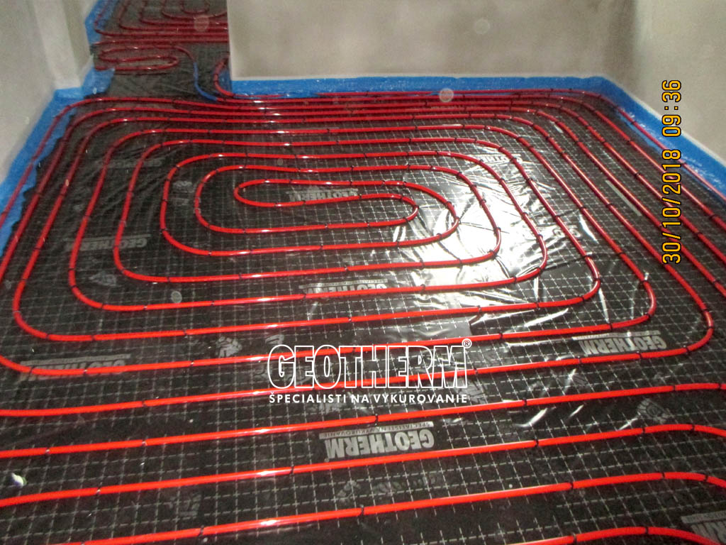 Podlahové vykurovanie REHAU Tacker systém ukotvenie sponkovaním vykurovacej rúrky k izolačnému podkladu. Objekt bude vykurovaný tepelným čerpadlom Vaillant zem-voda, 2x hlbinný vrt. Inštalácia podlahového vykurovania je v obci Bystrá, okres Brezno.