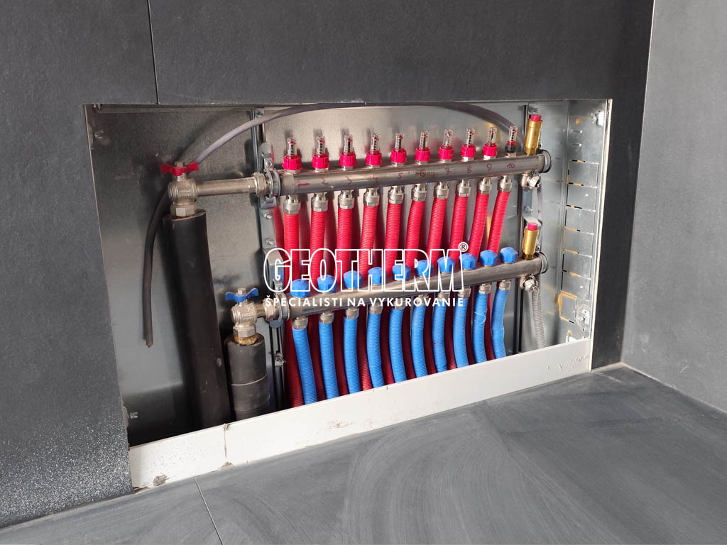 V rodinnom dome je inštalované podlahové vykurovanie/chladenie Rehau 155 m2 s temperovaním garáže, tepelné čerpadlo NIBE F2125-8 vzduch-voda+ VVMS320 (vybavená dotácia na tepelné čerpadlo) a vetracia jednotka NIBE ERS S10-400+ vzduchotechnika 12 tanierových ventilov- 6 prívodných a 6 odvodných.